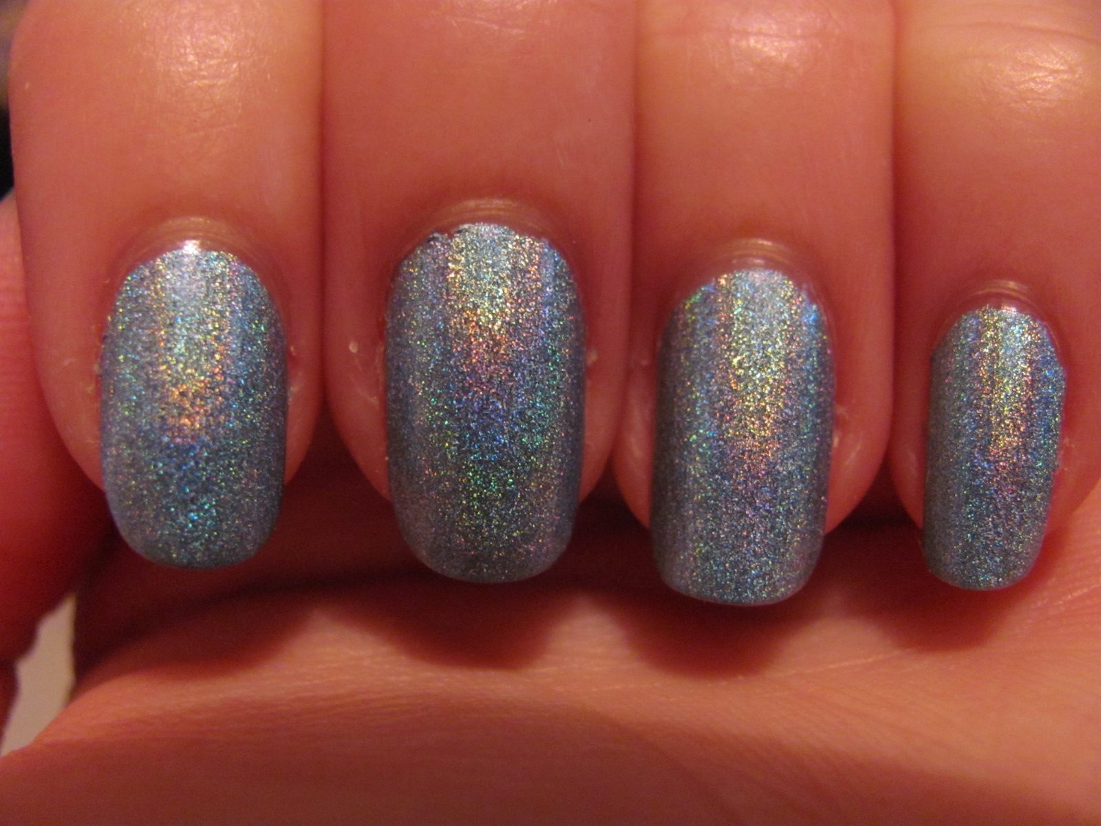 I will just point out some facts about this nail polish: it needs at least 2 coats to be fully opaque, it loses more than half of its holographic effect when we apply topcoat (or at least it happened after I applied Essence Nail Art Sealing topcoat) and it is a really, but really, difficult nail polish to work with. I wasn't able to get Nfu-Oh's Aqua base 'cause it was sold out but apparently it is easier to handle this nail polish with the Aqua base. I don't know either if with a topcoat of the same brand this nail polish will keep its holographic effect to its maximum..... oh well..... in some of the photos you will be able to see some gaps in the nail polish which was a consequence of a very tricky application! But moving on.... to solve this situation, after the two coats and the topcoat I applied a thirs coat ;) done!