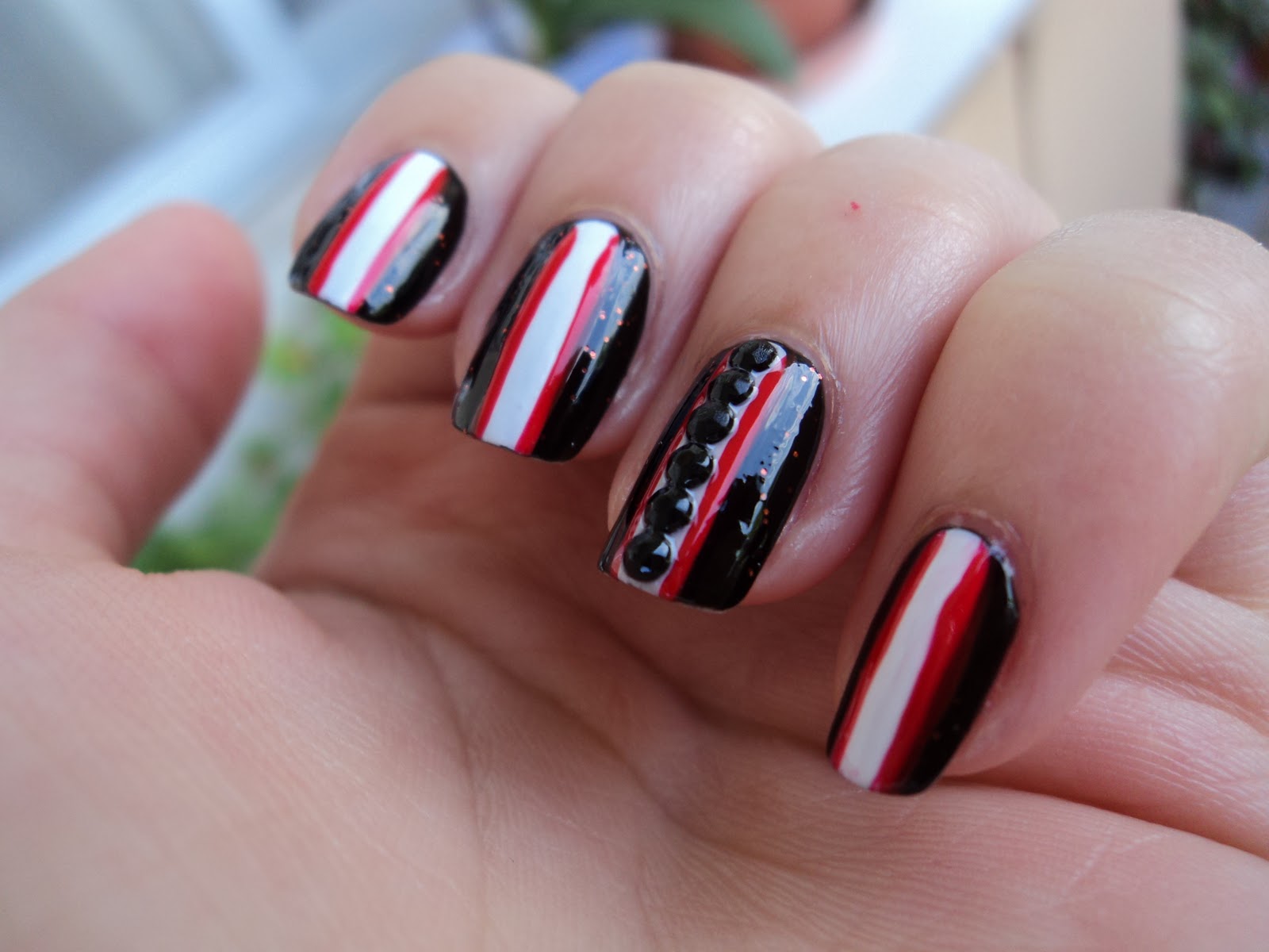 On the white stripes of my thumb and ring fingers nails I used black rhinestones all the way up the stripes.